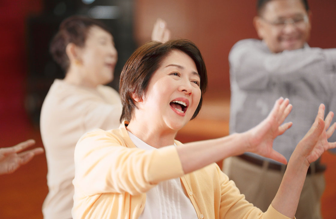 1960~80年代のヒットソングを映像を見ながら簡単なステップとハモリをつけて仲間と楽しく歌います。